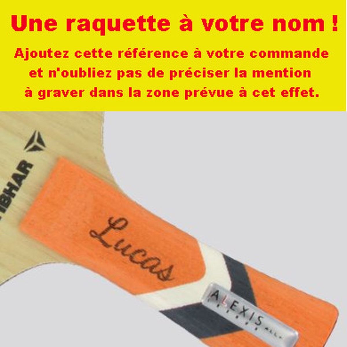 Pour 4,50 euro, nous gravons votre nom ou prénom dans le manche de votre raquette , sur le coffret raquette référence 0300117 ou votre éponge (uniquement les références 0610106,
